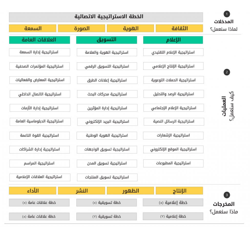 في هذه المرحلة نحن بحاجة إلى بناء إطار عام وشامل يشرح البنود العريضة للمنظومة الاتصالية ومكوناتها يضع المحددات الرئيسية لعمل المنظومة إتصاليًا.