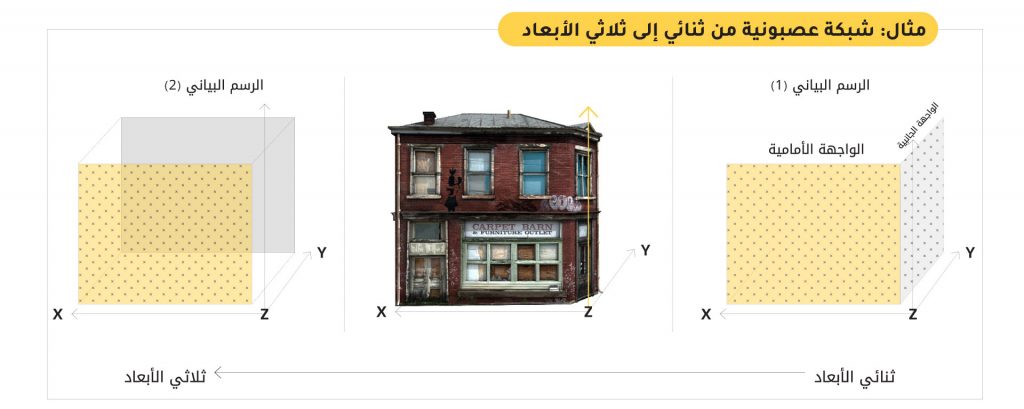 تمكن تقنية مجال الإشعاع العصبوني (NeRF) من دمج الصور المختلفة في صورة متكاملة خماسية الأبعاد عبر استخدام معلومات الألوان بصيغة RGB وبيانات الكثافة اللونية لاستيفاء النقاط غير المصورة في المشهد من كل الاتجاهات بشكل متسلسل حتى تكتمل صورة المبنى من جميع الجوانب. فعلى سبيل المثال، عند توفر صور للواجهة الأمامية والجانبية والخلفية فقط، تسهم التقنية في إعادة بناء باقي الجوانب تلقائياً.