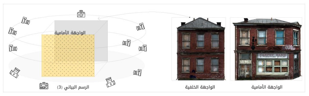 فعند تصوير مبنى من زوايا متعددة بكاميرا الهاتف المحمول، تكون النتيجة مجموعة من الصور الثنائية المنفصلة لكل زاوية وفقاً للرسم البياني (1). وعند دمج هذه الصور ينتج تصور ثلاثي الأبعاد للمبنى كما هو موضح في الرسم البياني (2). لمشاركة المشهد الكامل، يتطلب الأمر عادة إرسال جميع الصور وتوضيح الزوايا المختلفة لضمان استيعاب الشكل الكلي للمبنى.